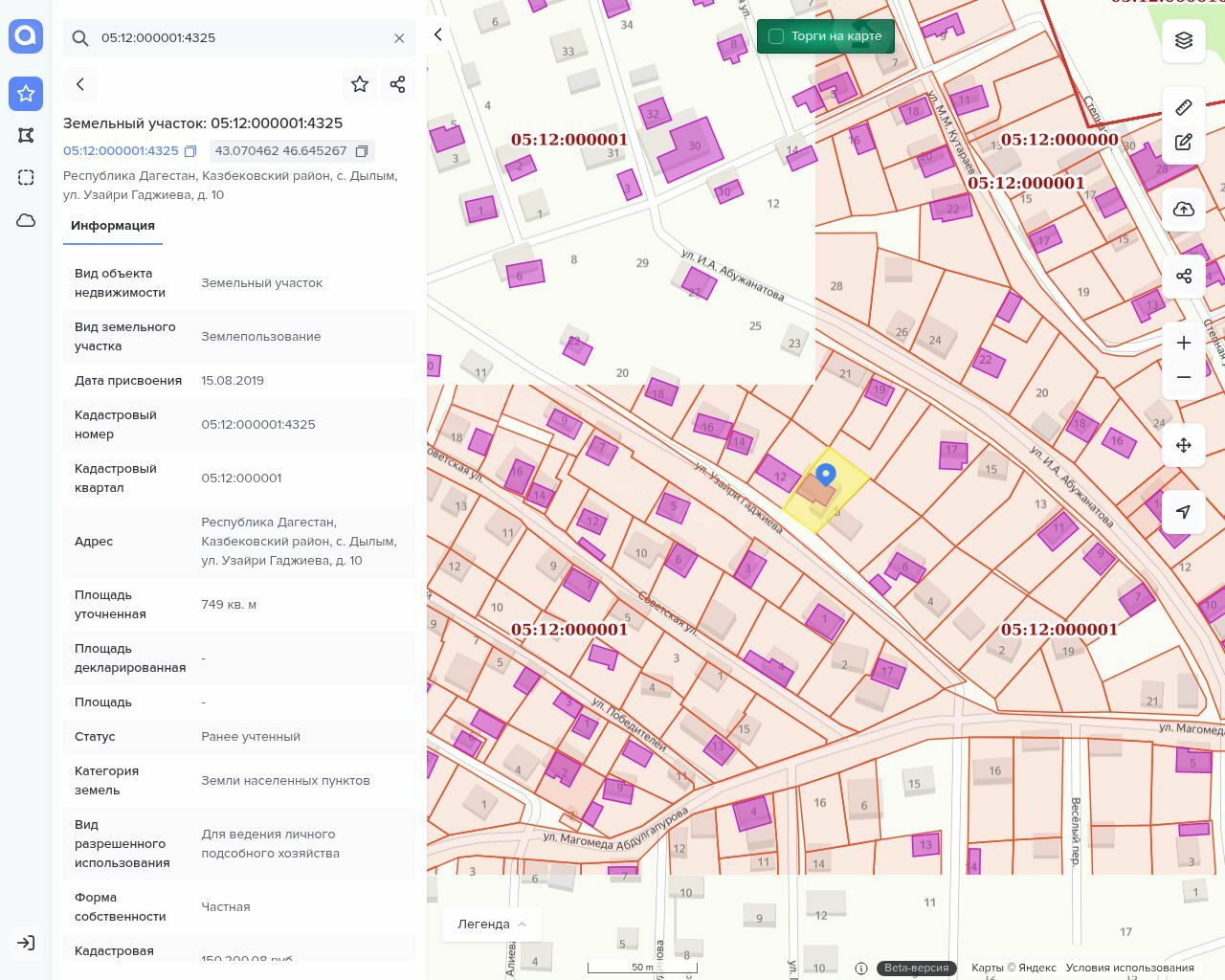 Земельный участок, общей площадью 749 +/- 9 кв. м., с кадастровым номером 05:12:000001:4325